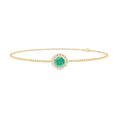 Ta delikatna bransoletka z kolekcji Pochodzenie wykonana jest z żółtego złota 18K, ozdobiona okrągłym szmaragdem o masie 0,384 ct otoczonym halo z 14 białych diamentów o łącznej masie 0,084 ct.