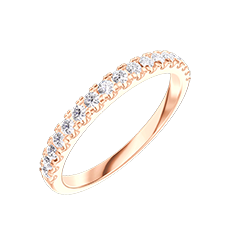 Ta obrączka damska wykonana z różowego złota 9K posiada klasyczny design półokrągłego mikro-pavé z 18 syntetycznymi diamentami o łącznej masie 0,25 ct, oferując subtelny blask i ponadczasową elegancję.