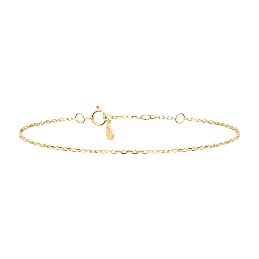 Nie, ten model to bransoletka łańcuszkowa bez kamieni, podkreślająca naturalne piękno żółtego złota 9 karatów i minimalistyczny, płynny design.