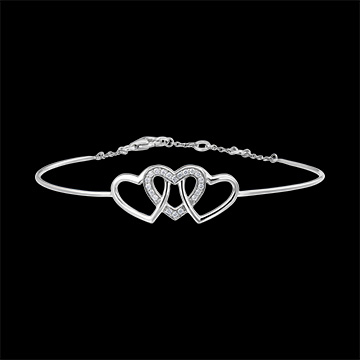 Bransoleta w kształcie koła z motywem trzech czule splecionych serduszek stanowiąca delikatne połączenie białego złota i szlifowanych diamentów. Bransoletka z zapięciem na łańcuszek dla dodatkowej wygody.