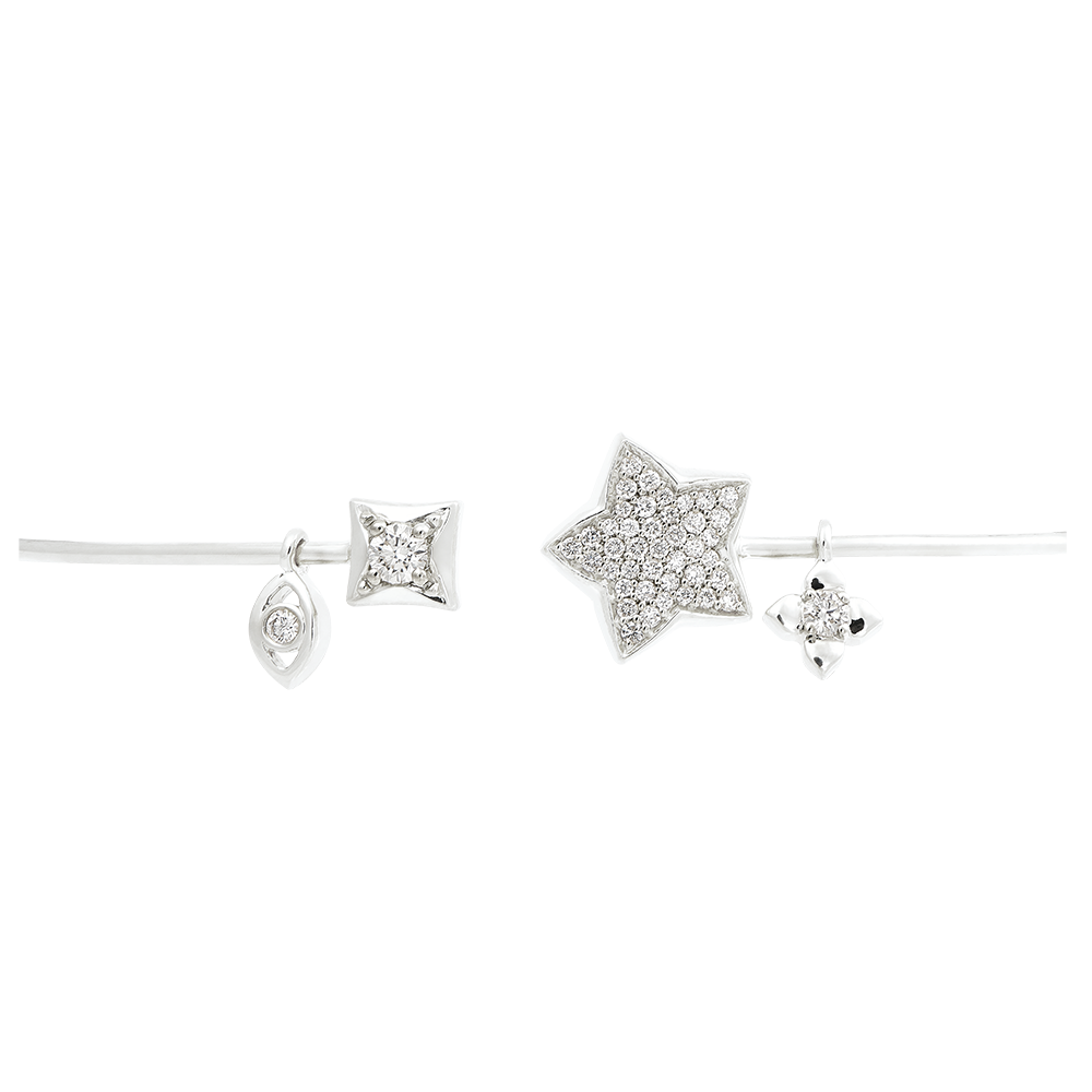 Bransoletka w kształcie koła z białego złota ozdobiona diamentowymi charmsami przynoszącymi szczęście.