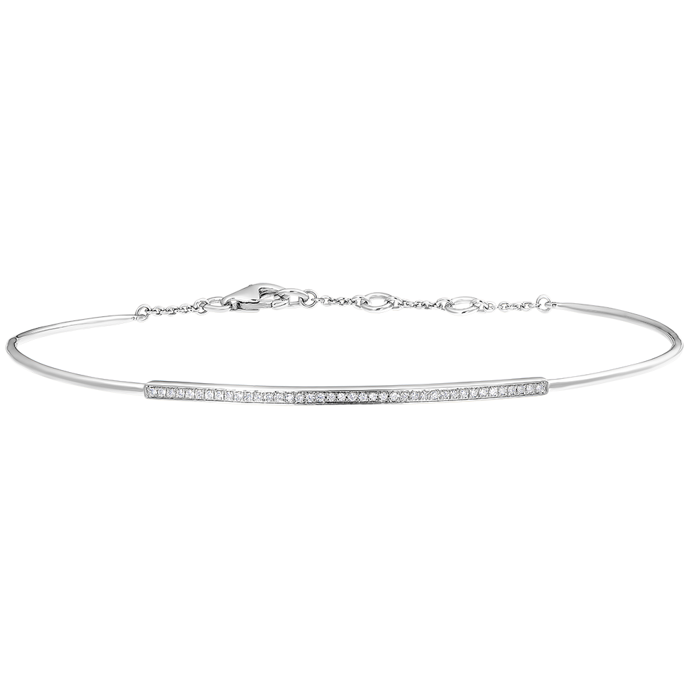 Subtelna bransoletka w kształcie koła z białego złota wysadzana plejadą 40 diamentów pięknie rozświetlającą nadgarstek. Bransoletka z zapięciem na łańcuszek dla dodatkowej wygody.