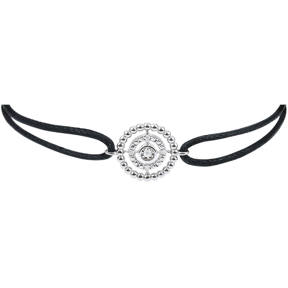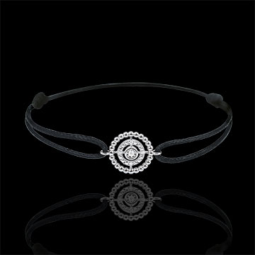 Koło ze złotych pereł otacza koło diamentów towarzyszących diamentowi środkowemu. Motyw jest przyczepiony do nowoczesnego czarnego sznurka.