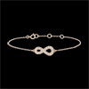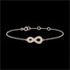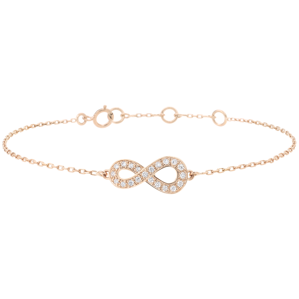 Znak nieskończoności z różowego złota wysadzany diamentami w formie bransoletki. Symbol absolutnej wieczności. Bransoletka o regulowanej długości: 18 cm, 17 cm, 16 cm. Wzór o długości 15 mm i wysokości 7 mm.
