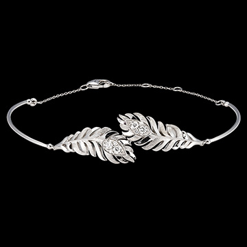 Bransoletka Signature z 9-karatowego białego złota z eleganckim motywem w kształcie pióra ozdobionym 8 syntetycznymi diamentami. Staranne wykonanie i dyskretne zapięcie. Całość odzwierciedla eteryczną subtelność i niezrównane wyrafinowanie cechujące pióra, będące symbolem kolekcji Panache.