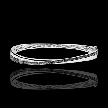 Bransoletka w kształcie koła wykonana z pierścienia z białego złota subtelnie przeplecionego z pierścieniem w całości wysadzanym czarnymi diamentami.
