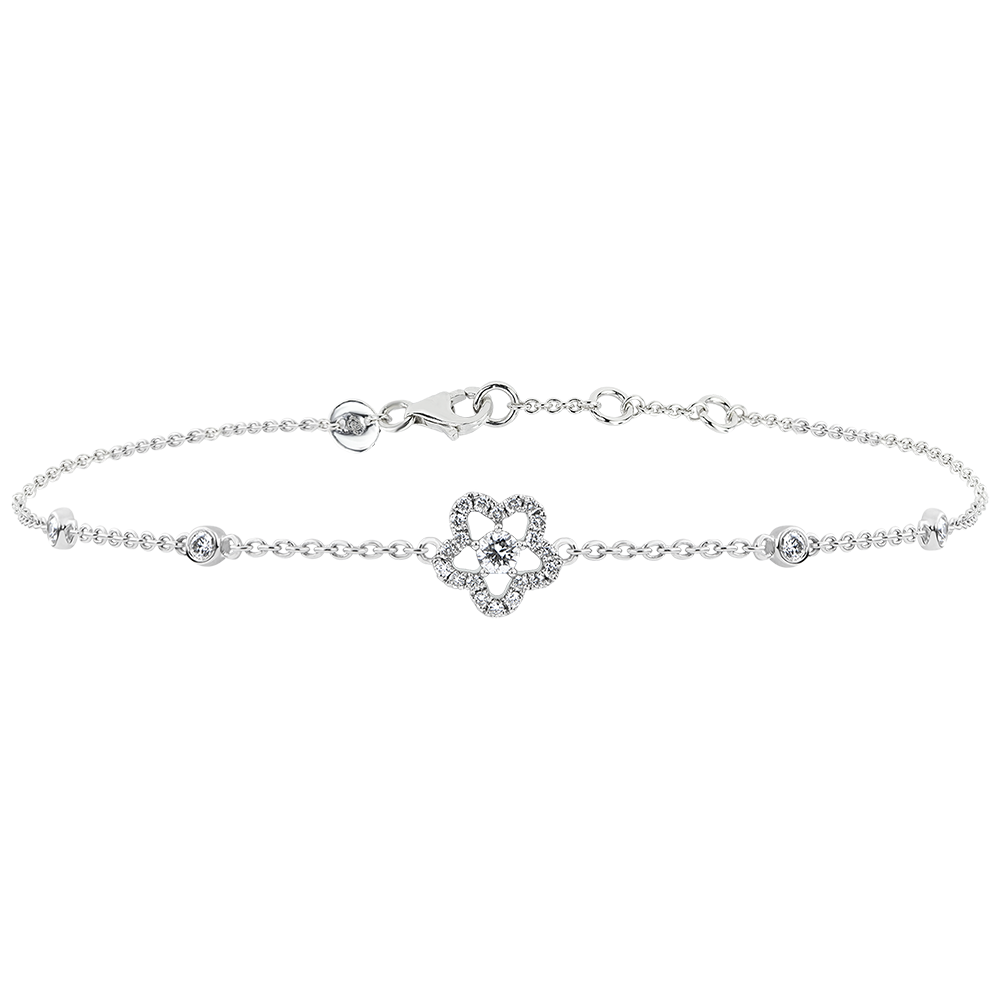 Słodka i delikatna bransoletka z białego złota ozdobiona diamentem środkowym otoczonym 5 płatkami z diamentów.