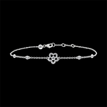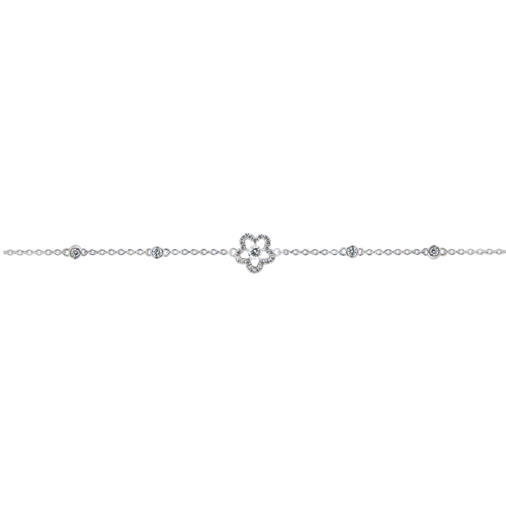 Słodka i delikatna bransoletka z białego złota ozdobiona diamentem środkowym otoczonym 5 płatkami z diamentów.