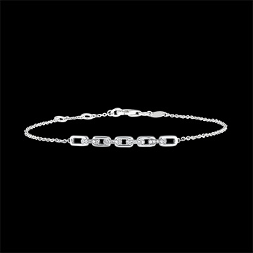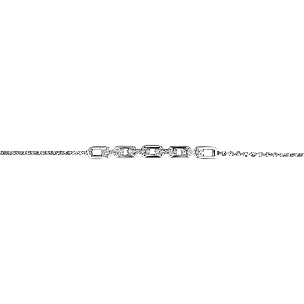 Pięć dużych kubańskich ogniw wysadzanych diamentami stanowiących kontrast z delikatnym łańcuszkiem, tworząc klasyczną bransoletkę z białego złota w nowoczesnej odsłonie. Bransoletka z możliwością regulacji długości: 18cm, 17cm, 16cm.