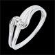 Pojedynczy diament osadzony w białym gładkim złocie o dynamicznej formie, otoczony i namiętnie przytrzymany podwójną krzywizną ze złota poddaną obróbce na wzór diamentu. Diament środkowy: 0,013 karata