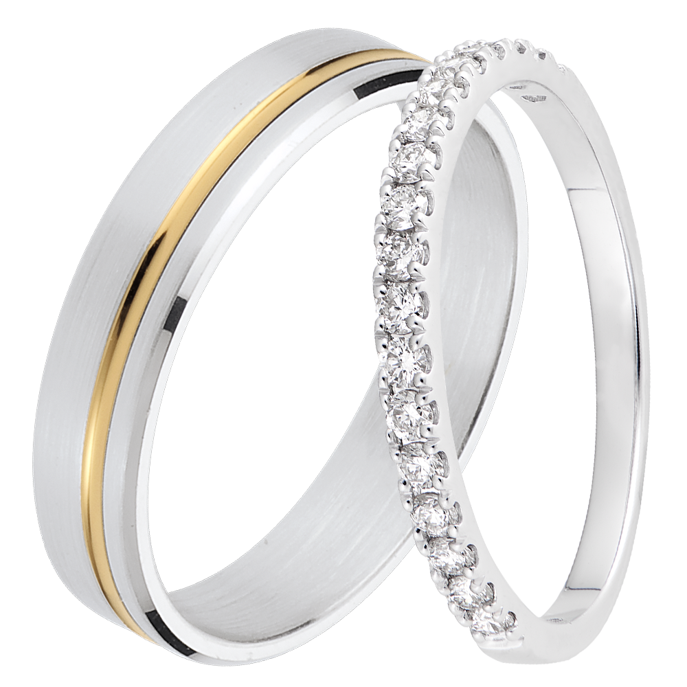 Duet obrączek Pure & Bettina – złoto białe i żółte & złoto białe z diamentami – 18 karatów
