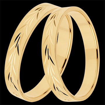 Obrączka z żółtego złota z grawerowanym wyrafinowanym motywem roślinnym, aby nadać jej jak najwięcej blasku.
