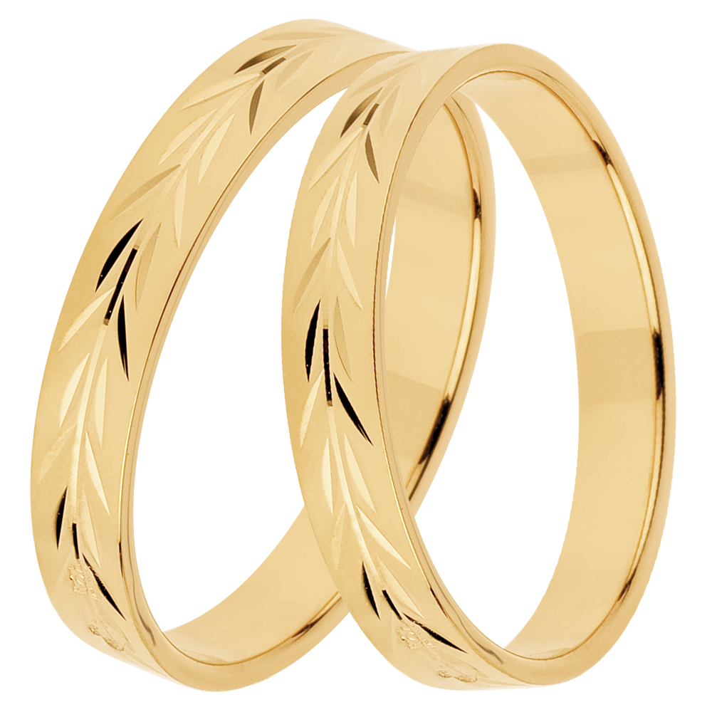 Elegancka para obrączek z żółtego złota, ozdobiona subtelnym, roślinnym wzorem. Idealny symbol na wyrafinowane świętowanie Waszego związku.