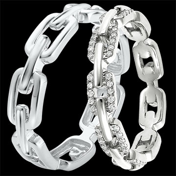 Duże kubańskie ogniwa wysadzane diamentami rozświetlają ten pierścionek z białego złota, nadając mu klasyczny charakter w nowoczesnej wersji.