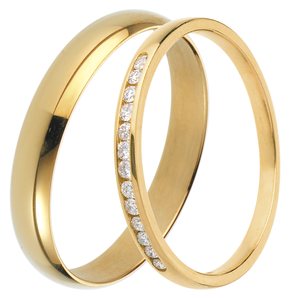 Elegancka para obrączek dla niej i dla niego. Dla niej pół-pavé z szyną i 13 diamentami po 0,1 karata; dla niego polerowany żółty złoty pierścień o szerokości 3,5 mm.…