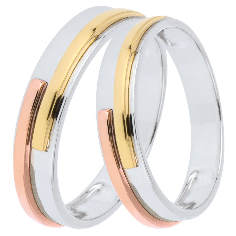 Pasek z białego złota otoczony wstążką z żółtego i różowego złota. Nowoczesna i niepowtarzalna obrączka z trzech rodzajów złota.