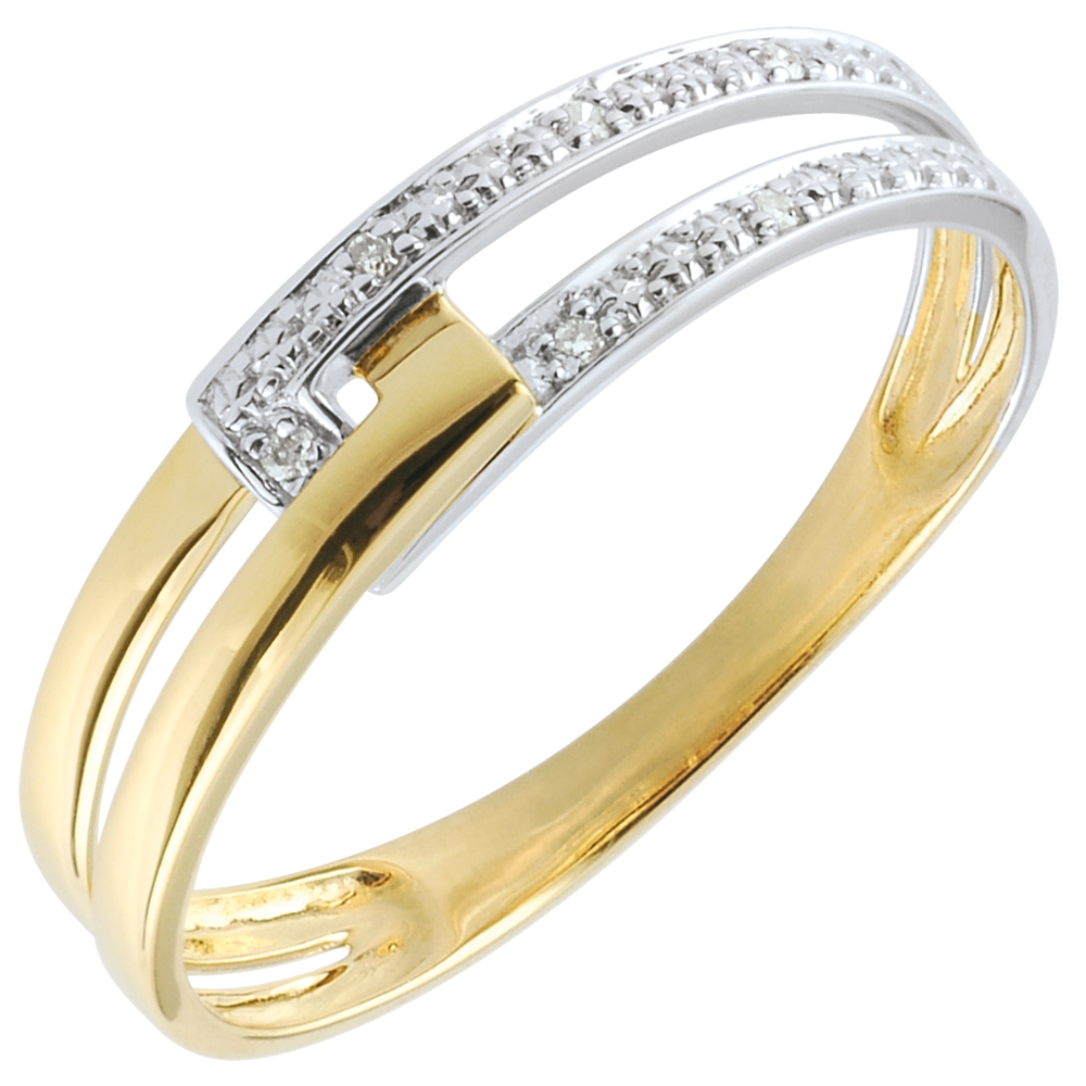 Dwa połączone prostokąty, złoto żółte w tandemie ze złotem białym i diamentami.