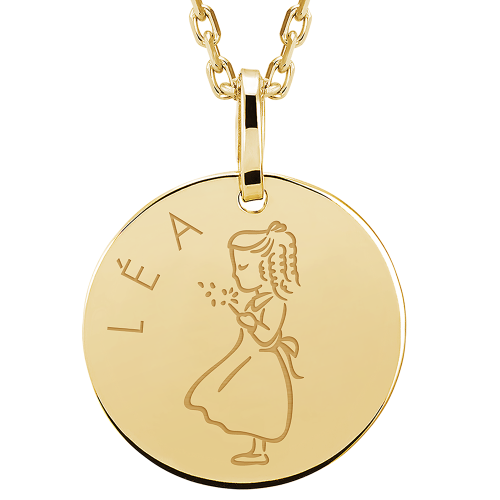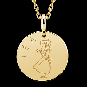 Ta zawieszka to okrągły medalik wykonany w całości z żółtego złota 9 karat, ozdobiony delikatnym grawerunkiem. Należy do kolekcji Lovely Yours, stworzonej, by zachować cenne wspomnienia.