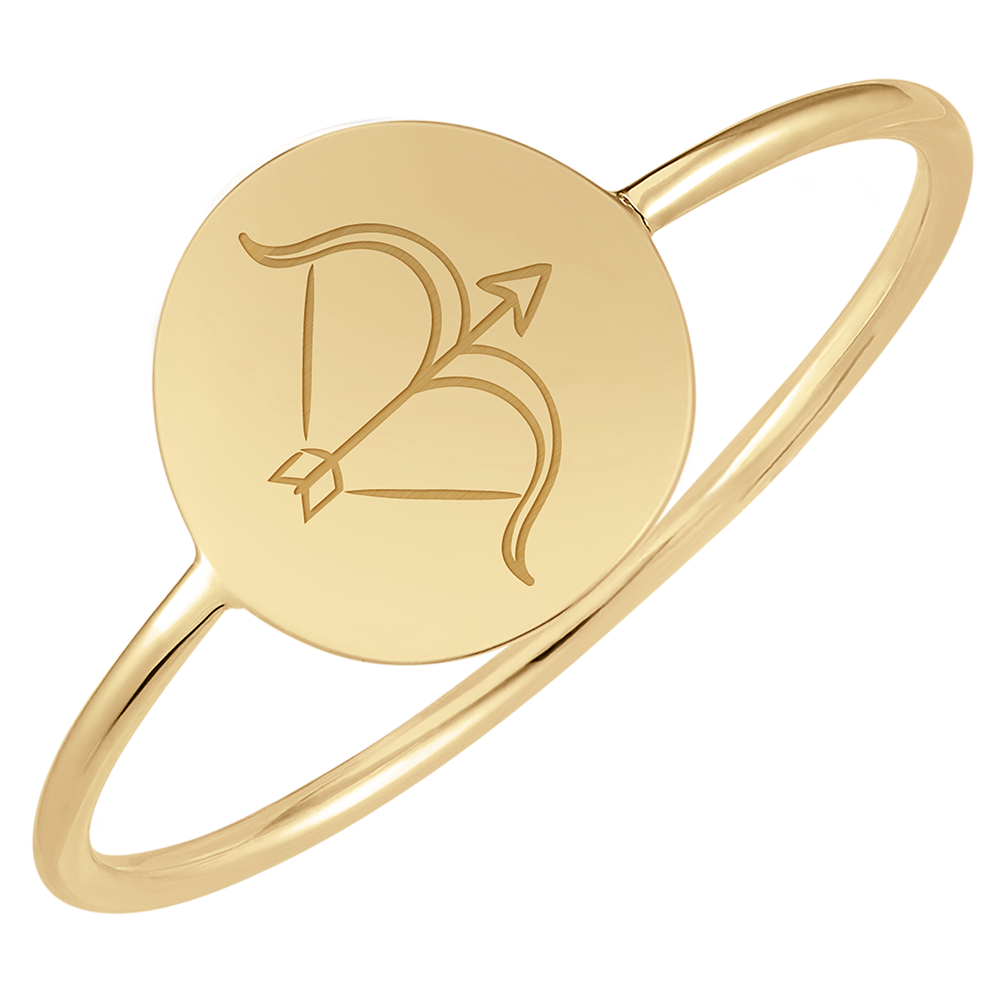 Poznaj ten delikatny pierścionek wykonany z żółtego złota 9 karat, ozdobiony okrągłym medalionem z grawerem znaku Strzelca. Minimalistyczny design podkreśla subtelną i elegancką personalizację.