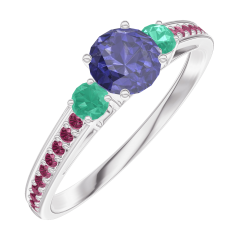 « L'ATELIER » NR 161292Pierścionek Białe złoto 375 - Niebieski szafir okrągły 0.3 karat - Kamienie boczne Szmaragd - Oprawa Rubin 4.5 (36)