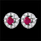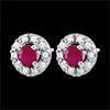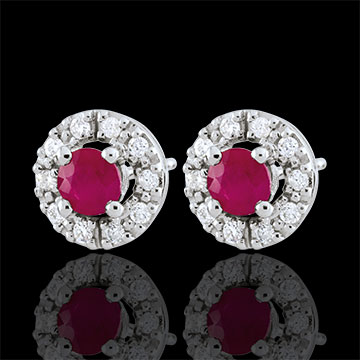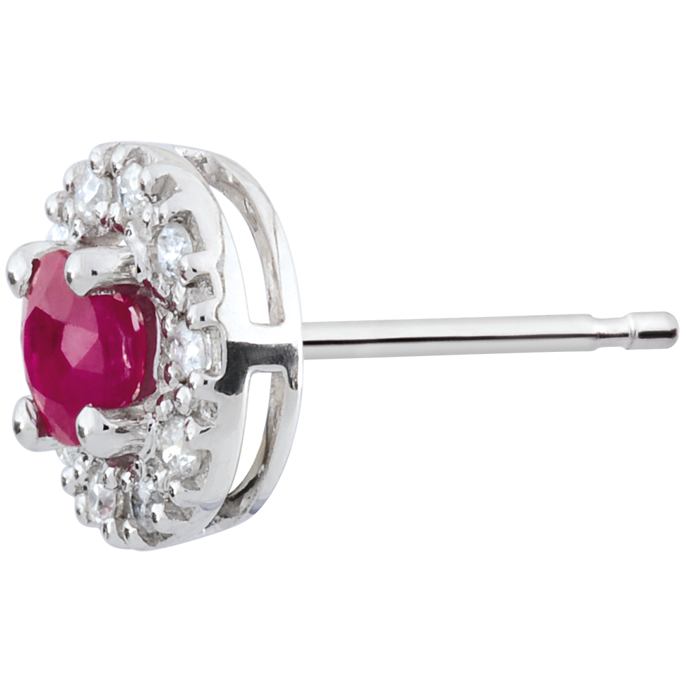 Koło z białego złota wysadzane diamentem stanowi osłonę dla rubinu niczym gniazdo.