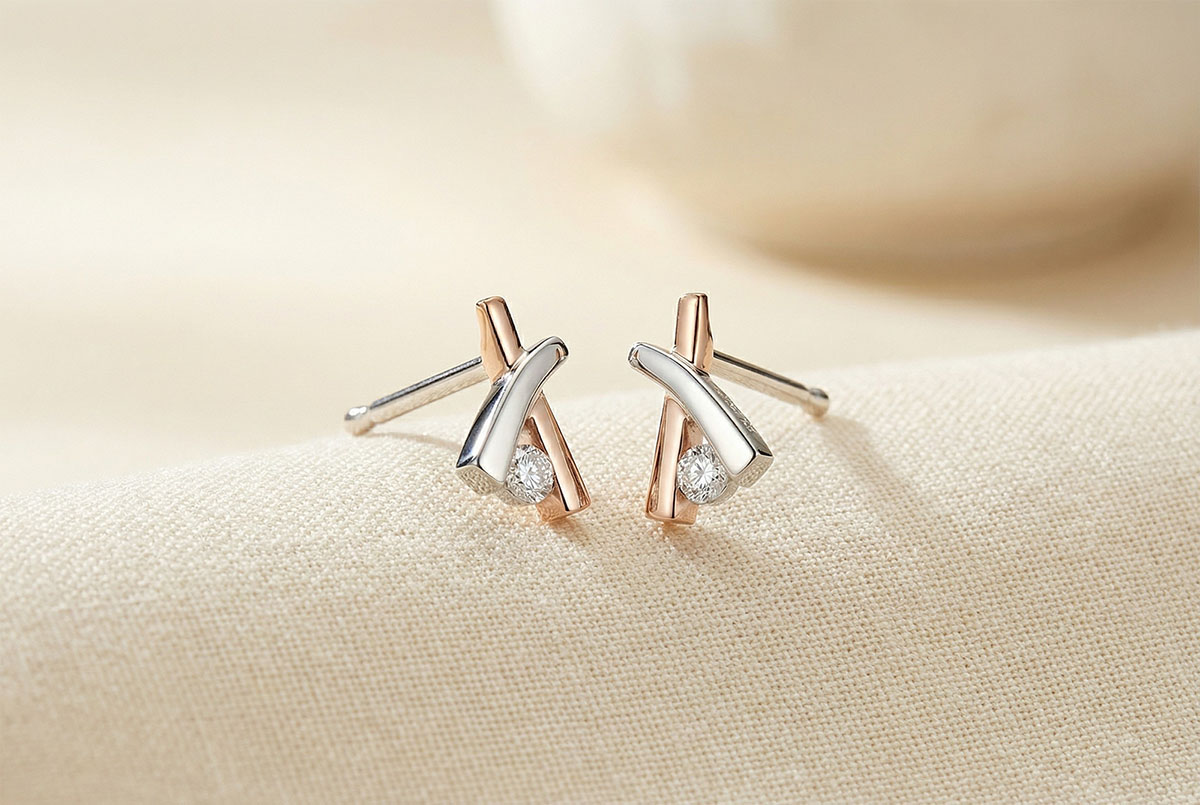Kunsztowny krzyż z białego i różowego złota z diamentem na środku każdego kolczyka.
