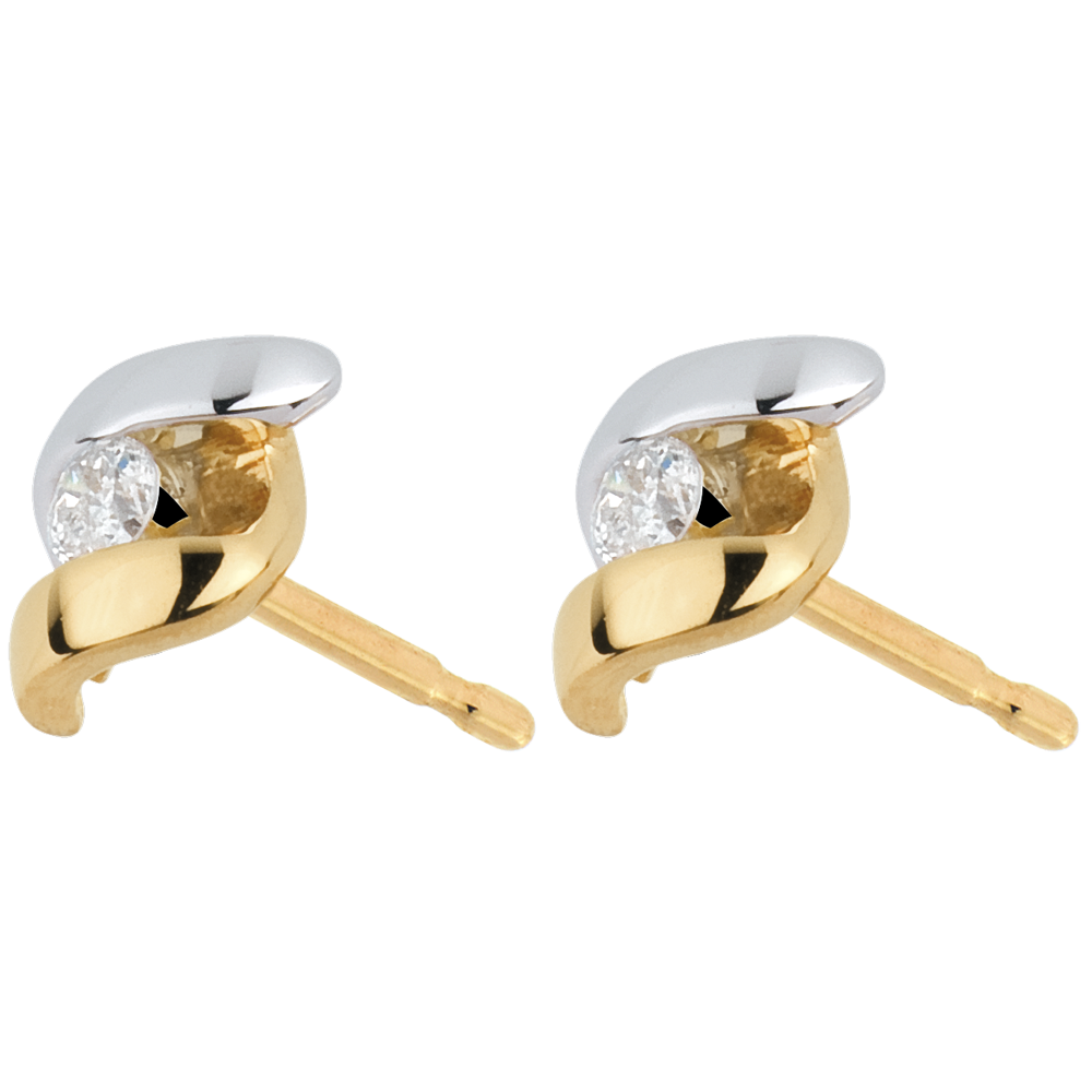 Przecinek z żółtego złota łączący się z przecinkiem z białego złota z diamentem w każdym kolczyku.