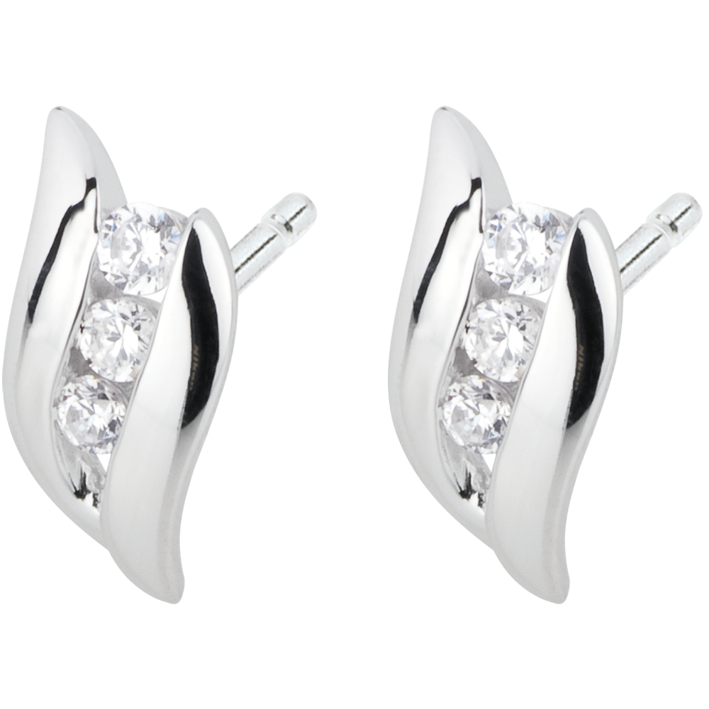 Trzy diamenty osadzone w krzywiźnie białego złota w każdym kolczyku.