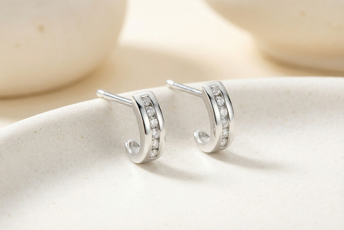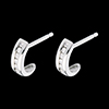 Doskonały łuk z diamentów w oprawie kanałowej, podkreślonych listewką w kształcie półksiężyca z białego złota w parze kolczyków promieniejącej blaskiem.
