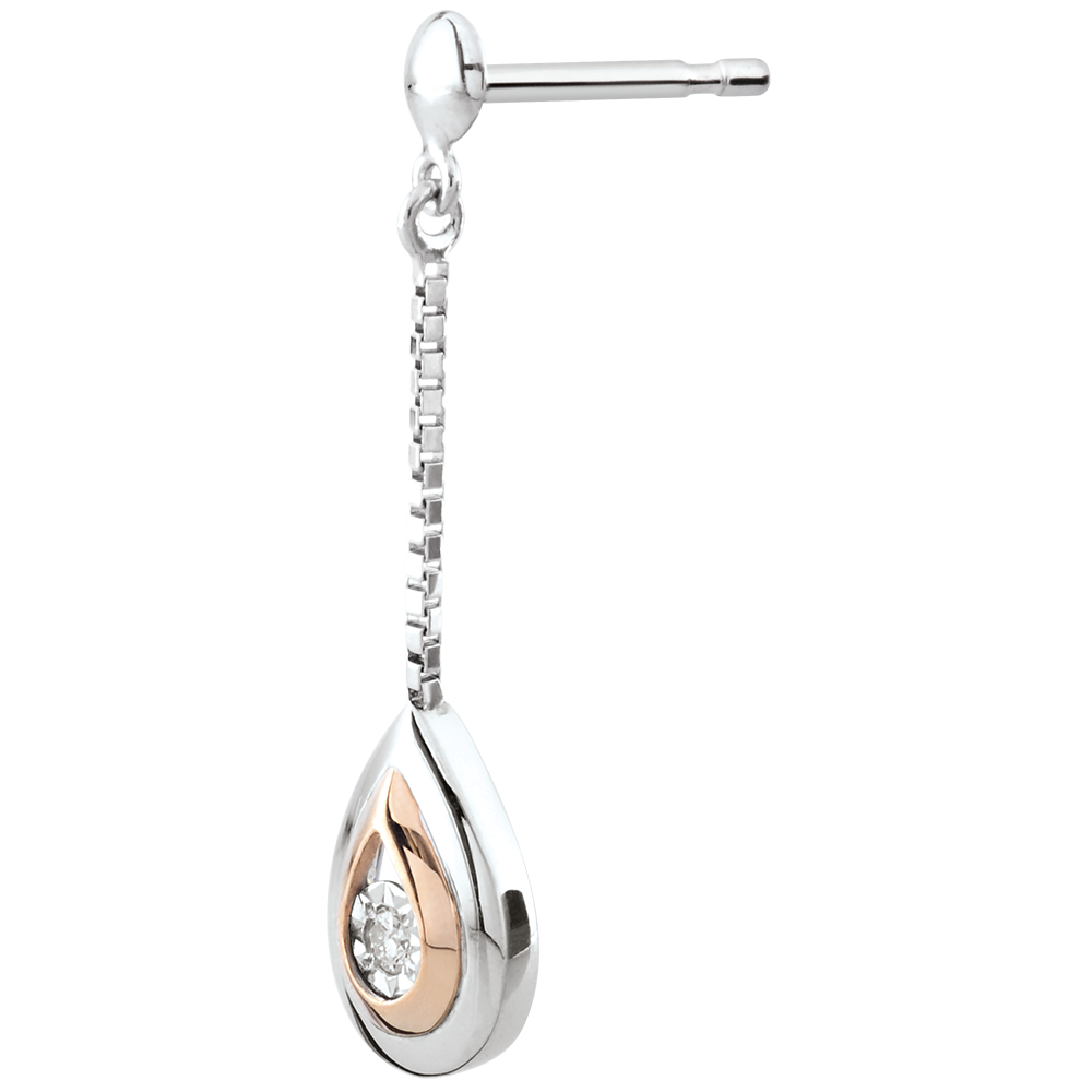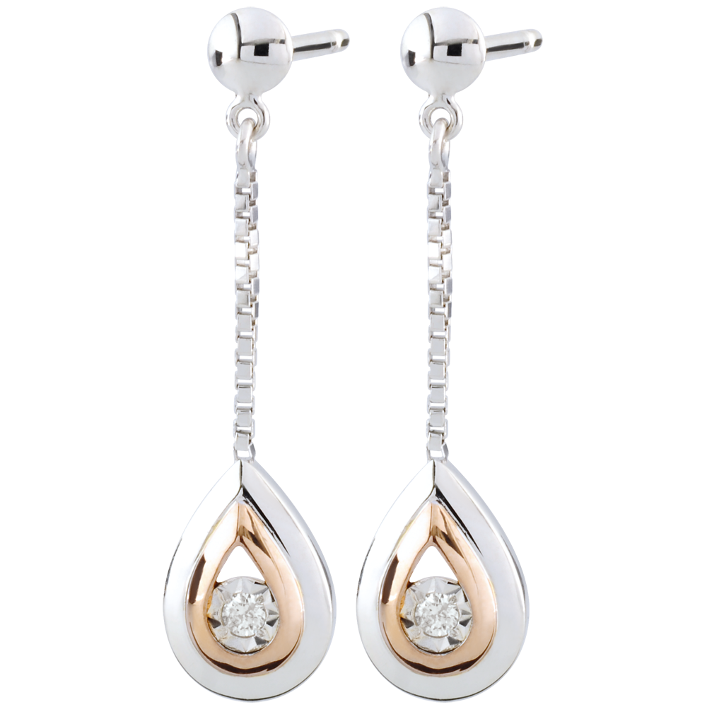 Dwie delikatne łzy z białego i różowego złota z błyszczącym diamentem na środku.