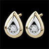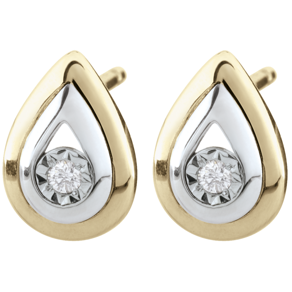 Dwie delikatne łzy z białego i żółtego złota z błyszczącym diamentem na środku.