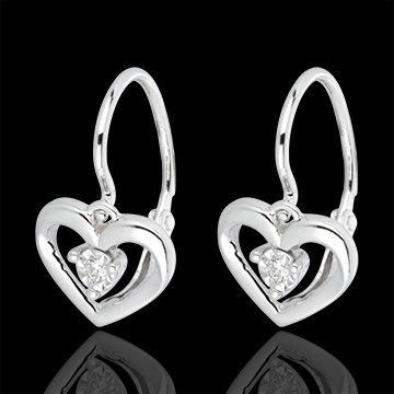 Diament zatopiony w małym, finezyjnym sercu na oprawie każdego kolczyka z białego złota. Model bigiel