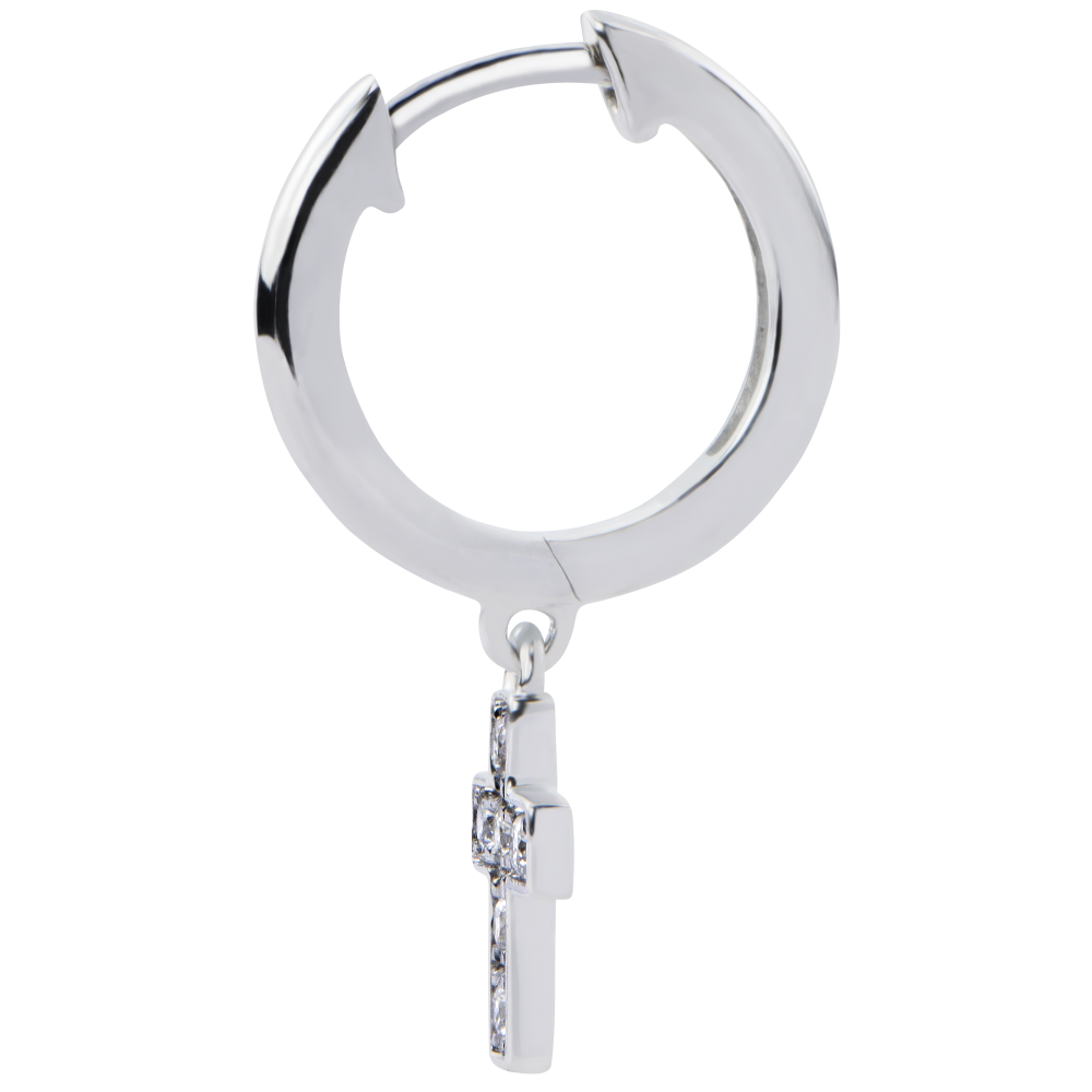 Kolczyki w kształcie koła z wisiorkami w kształcie krzyżyka wysadzanego diamentami. Religijny symbol w nowoczesnym rockowym wydaniu.