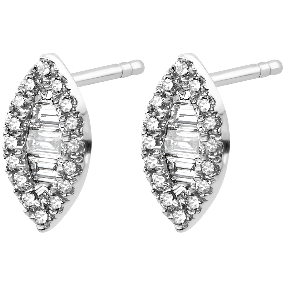 Trzy diamenty o szlifie bagieta podkreślone diamentami w kształcie łezki w delikatnej i kobiecej parze kolczyków o formie inspirowanej bajkami wschodnimi.