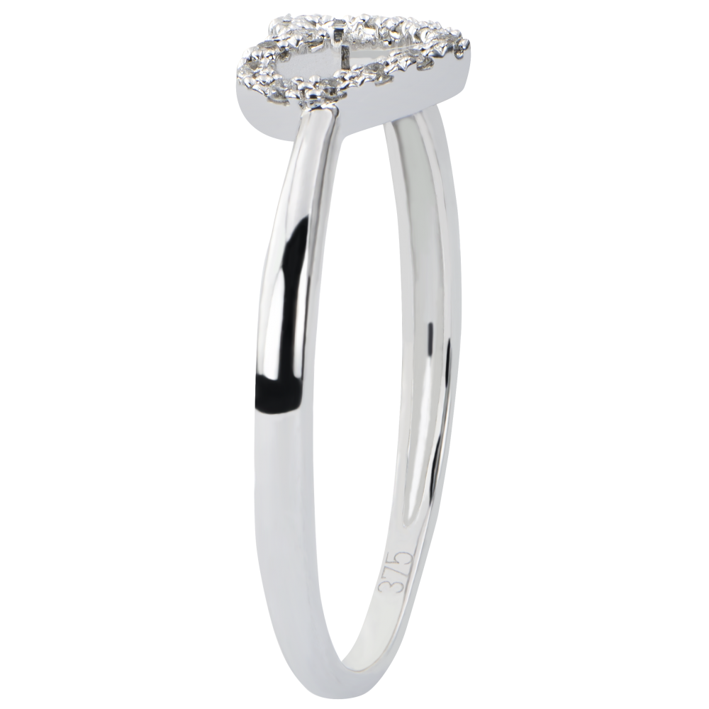 Wysadzane diamentami kontury ażurowego serca w pierścionku o podstawowej i świeżej formie. Czyste i delikatne przesłanie bez niedomówień.