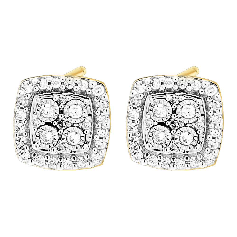 Blask kolczyków z kwadratowym diamentem otoczonym diamentową aureolą. Szlachetne i subtelne kolczyki z białego i żółtego złota emanujące ponadczasową elegancją.…