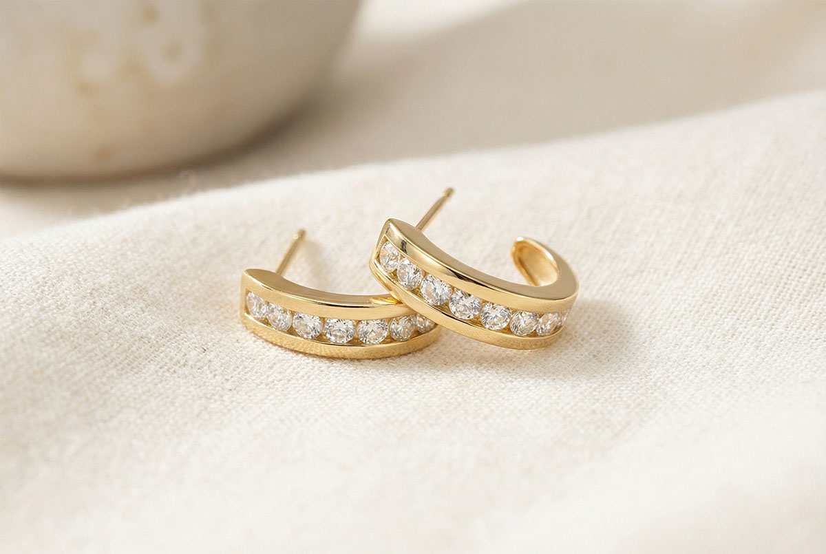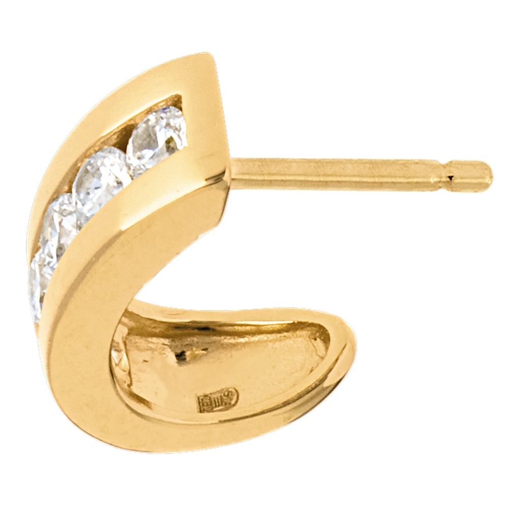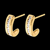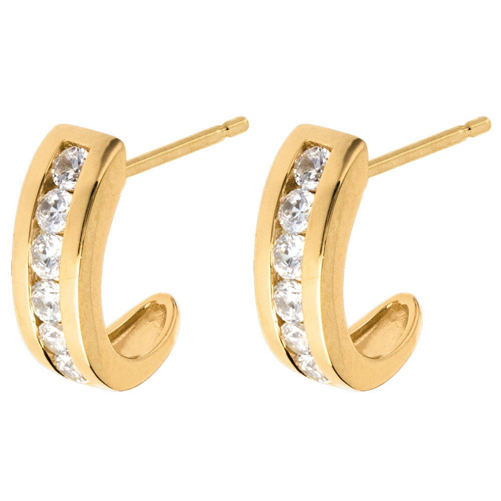 Doskonały łuk z diamentów w oprawie kanałowej, podkreślonych listewką w kształcie półksiężyca z żółtego złota w parze kolczyków promieniejącej blaskiem.