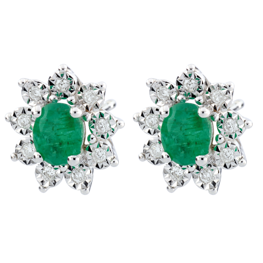 Na każdym sztyfcie owalny szmaragd stanowi środek margerytki z białego złotka z płatkami wysadzanymi diamentem.