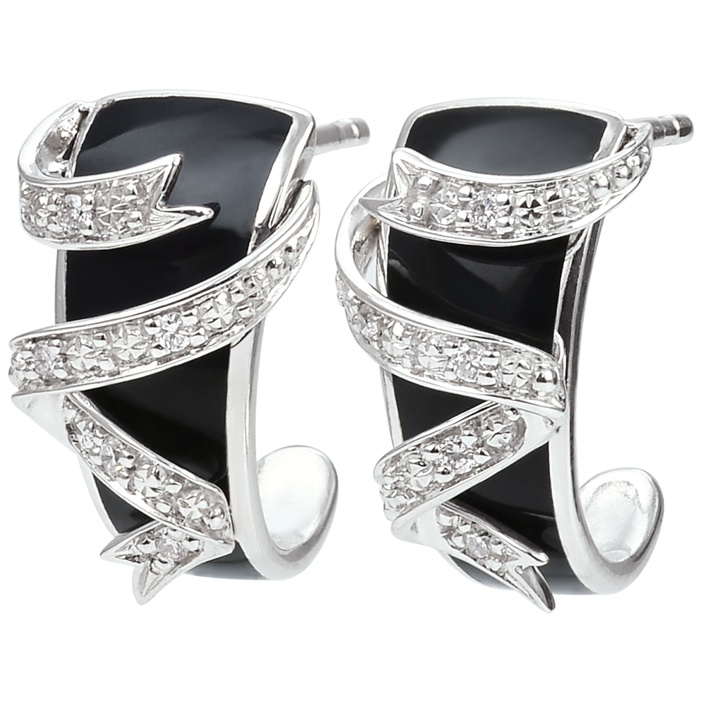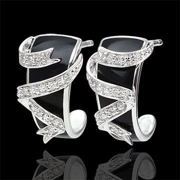 Kolczyk z czarnej laki otoczonej delikatną wstążką z białego złota bogato wysadzaną diamentami. Czysta elegancja.