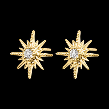 Te kolczyki sztyfty przedstawiają motyw promiennej gwiazdy, ozdobiony dwoma syntetycznymi diamentami o łącznej masie 0,2 karata. Wykonane z żółtego złota 9 karatów, dodają słonecznego, graficznego akcentu codziennemu stylowi.