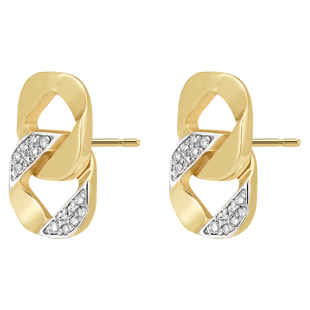 Kolczyki sztyfty z żółtego złota wykonane z dwóch ogniw łańcuszka, przy czym jedno z nich jest zdobione diamentami.