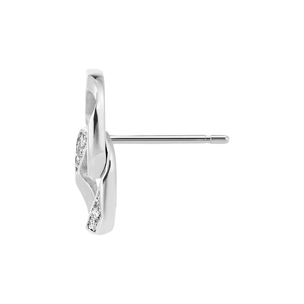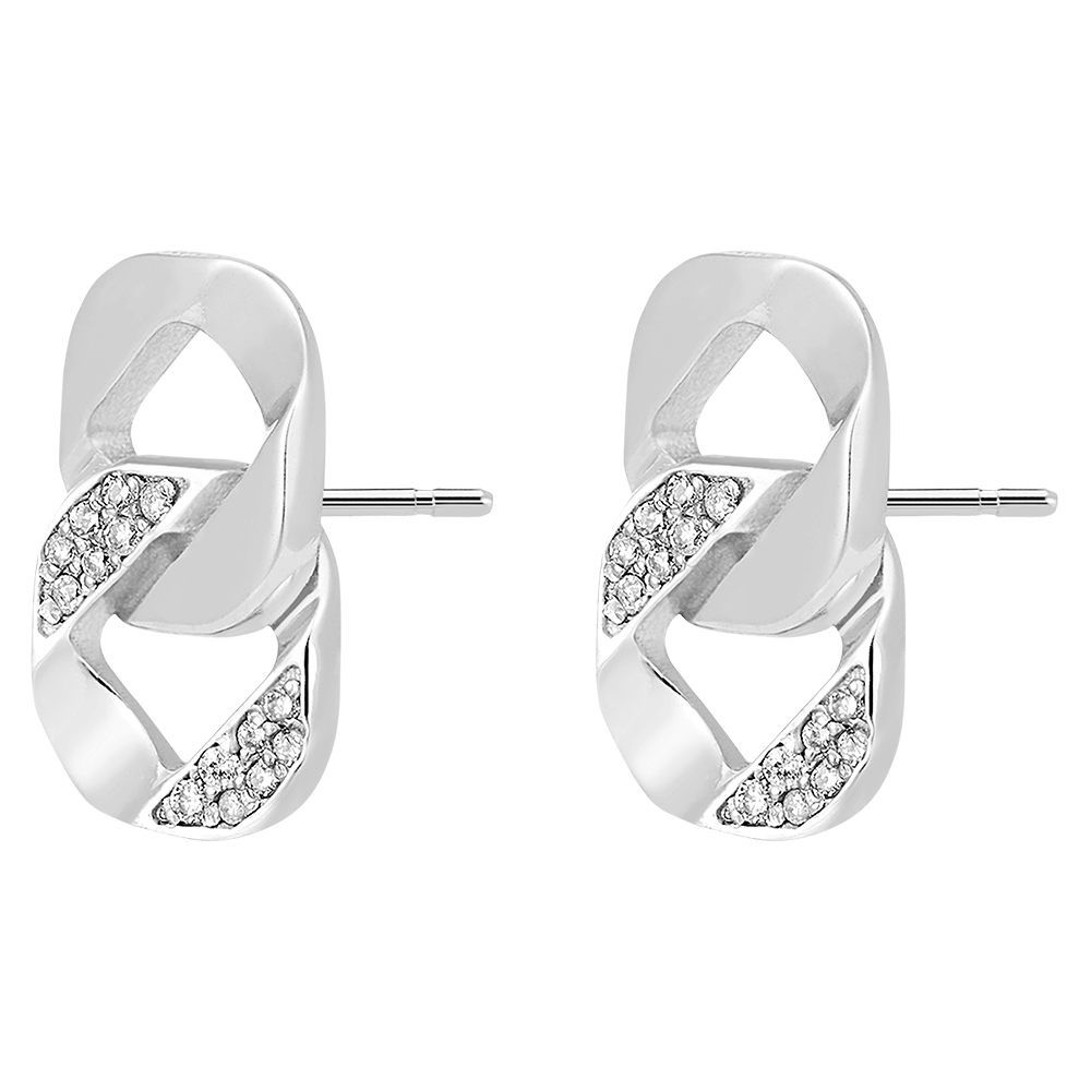 Kolczyki sztyfty z białego złota wykonane z dwóch ogniw łańcuszka, przy czym jedno z nich jest zdobione diamentami.