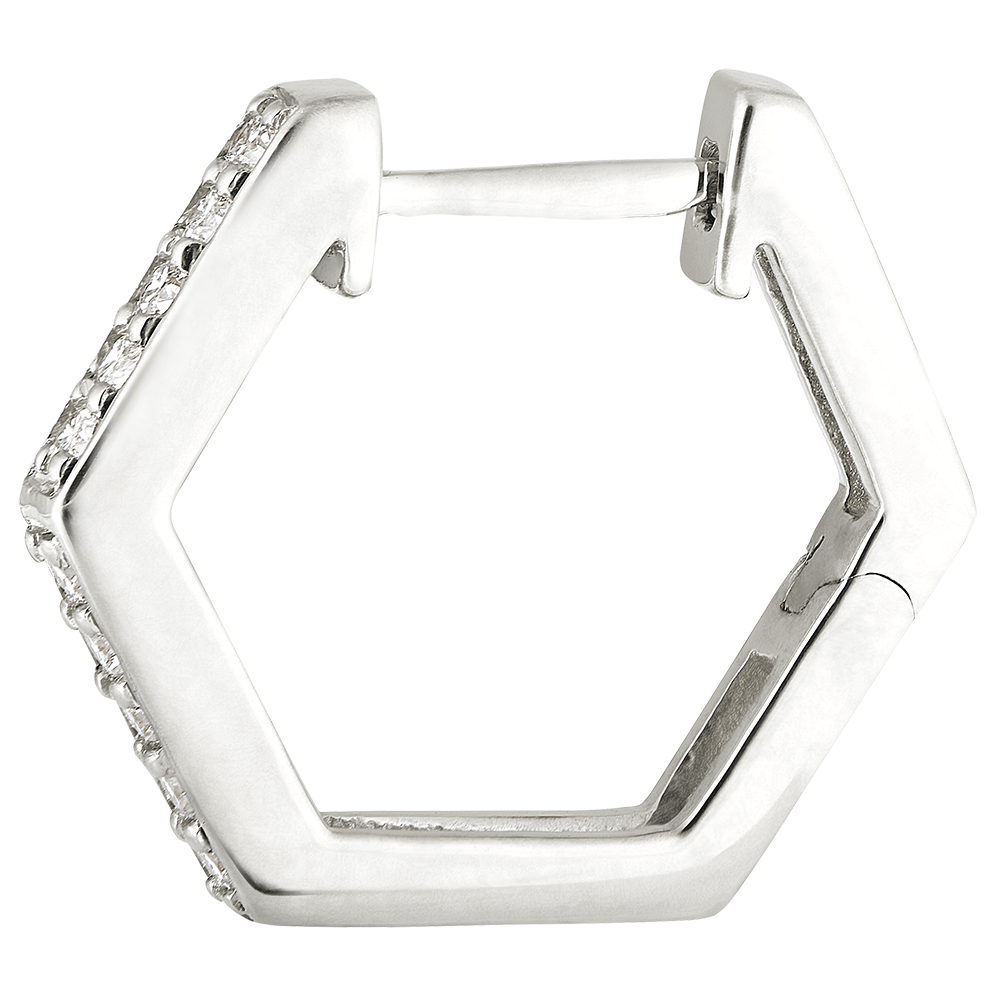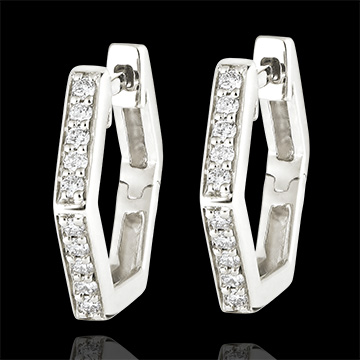 Kolczyki w kształcie sześciokąta z białego złota, wysadzane subtelnymi diamentami dla uzyskania graficznego i nowoczesnego efektu. Biżuteria o wyrazistej osobowości.