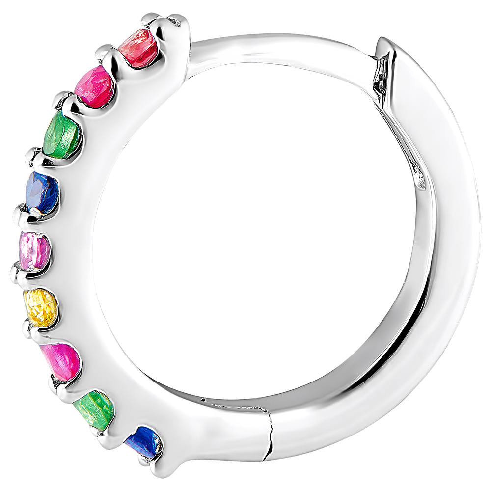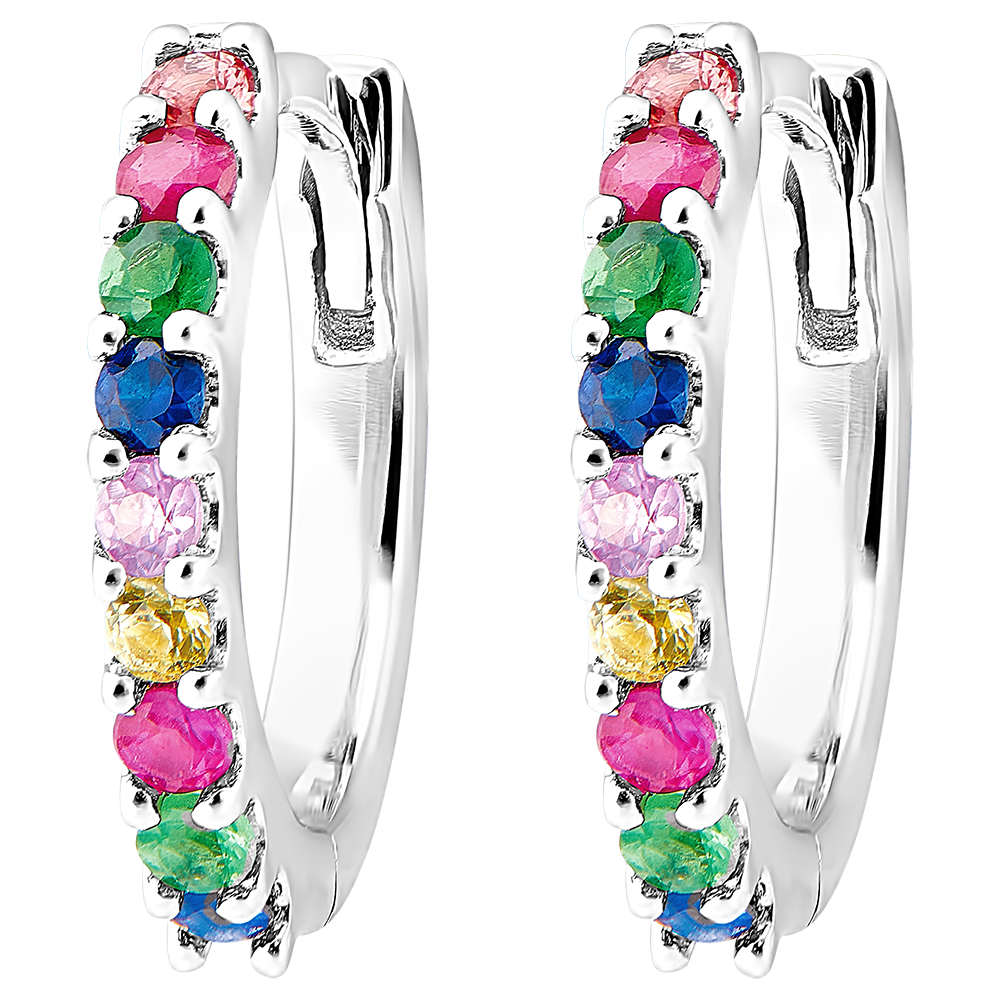 Tęcza kolorów rozświetla te kolczyki z białego złota i kamieni szlachetnych. Ozdobione zostały pomarańczowymi i czerwonymi rubinami, szmaragdami, błękitnymi, różowymi i żółtymi szafirami.