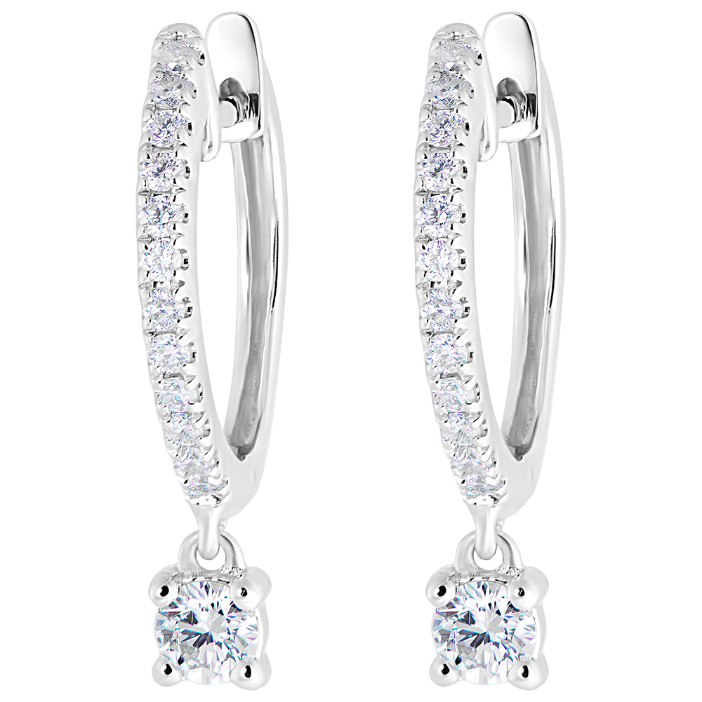 Kolczyki typu kreolki z białego złota częściowo wysadzane diamentami z zawieszką inkrustowaną diamentami, która nadaje szlachetny i efektowny akcent.