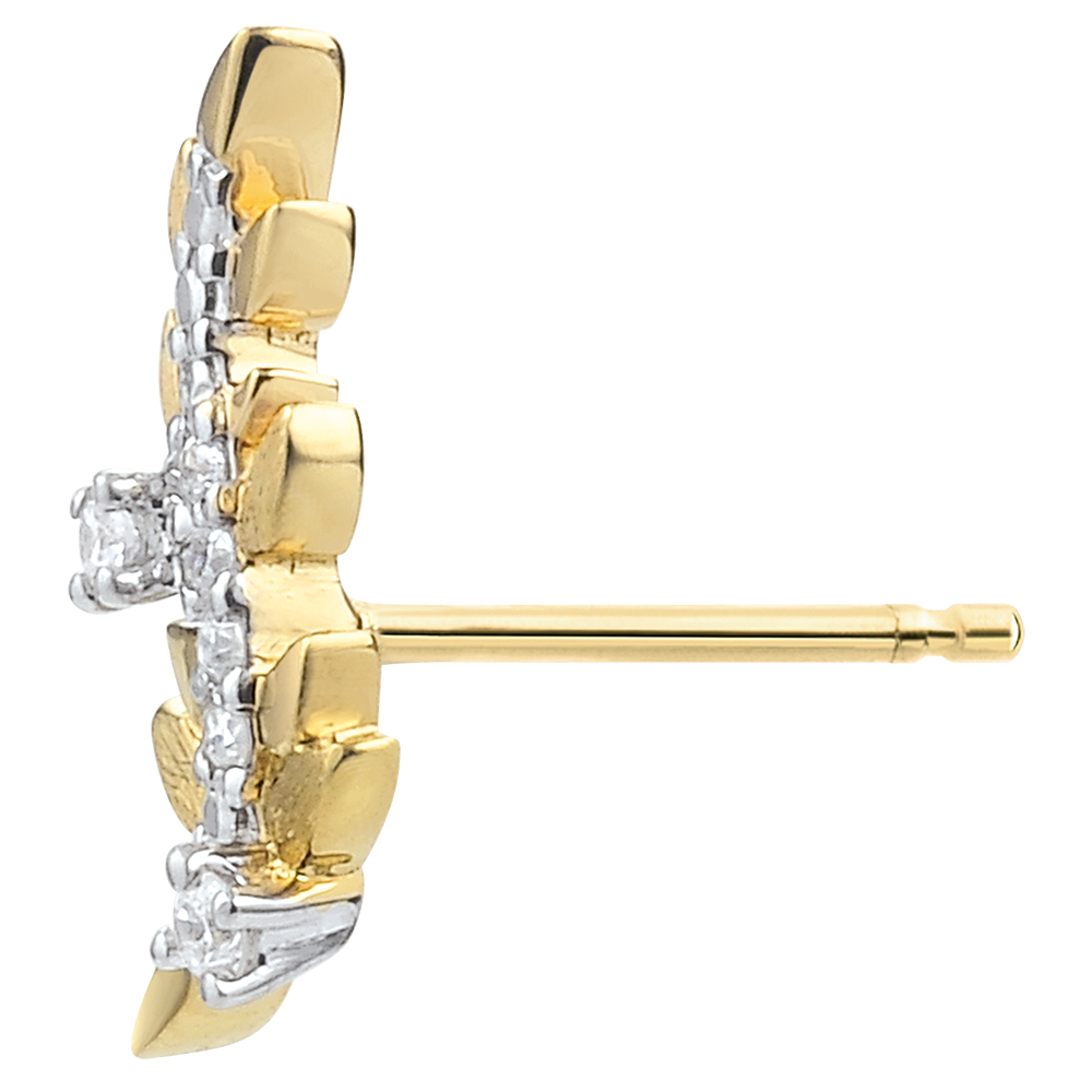 Romantyczne kolczyki wysadzane 12 diamentami, wykonane naprzemiennie z błyszczących liści z żółtego złota i z liści ze złota szczotkowanego ręcznie.