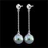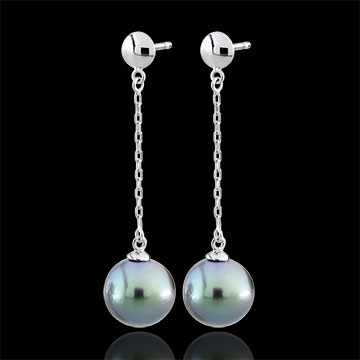 Dwie subtelne szare perły o okrągłym kształcie zawieszone na cienkim łańcuszku z białego złota, tworząc wyrafinowane i kobiece kolczyki wiszące.