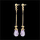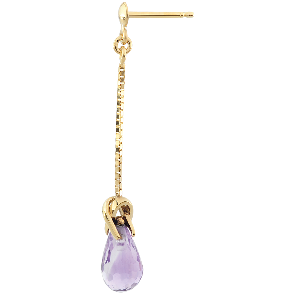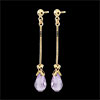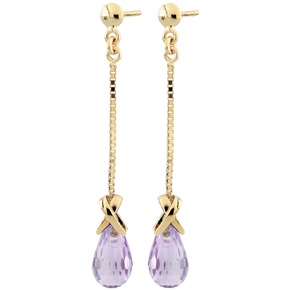 Dwie krople z ametystu przytrzymywane przez złoty krzyżyk, poruszające się z blaskiem przy uszach.