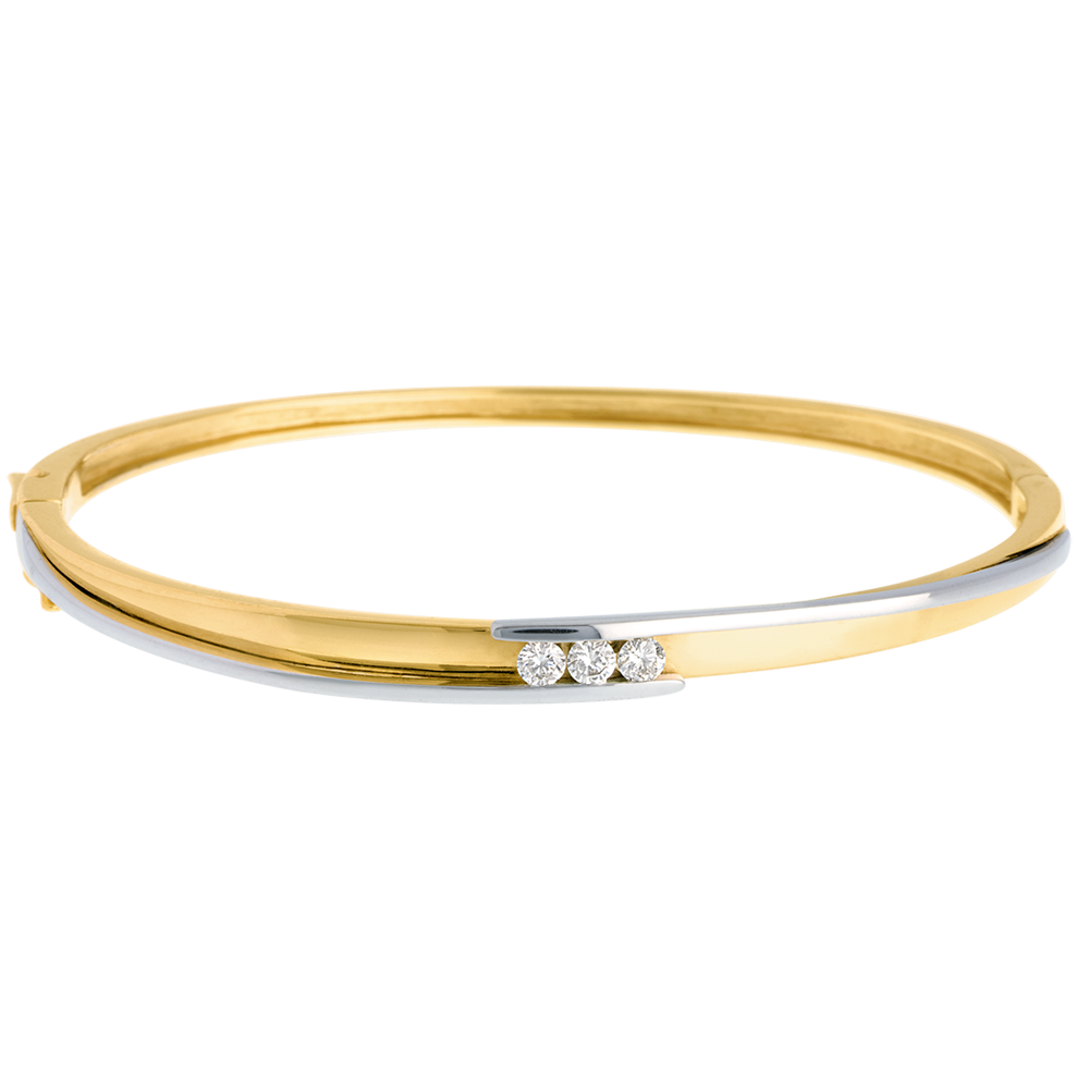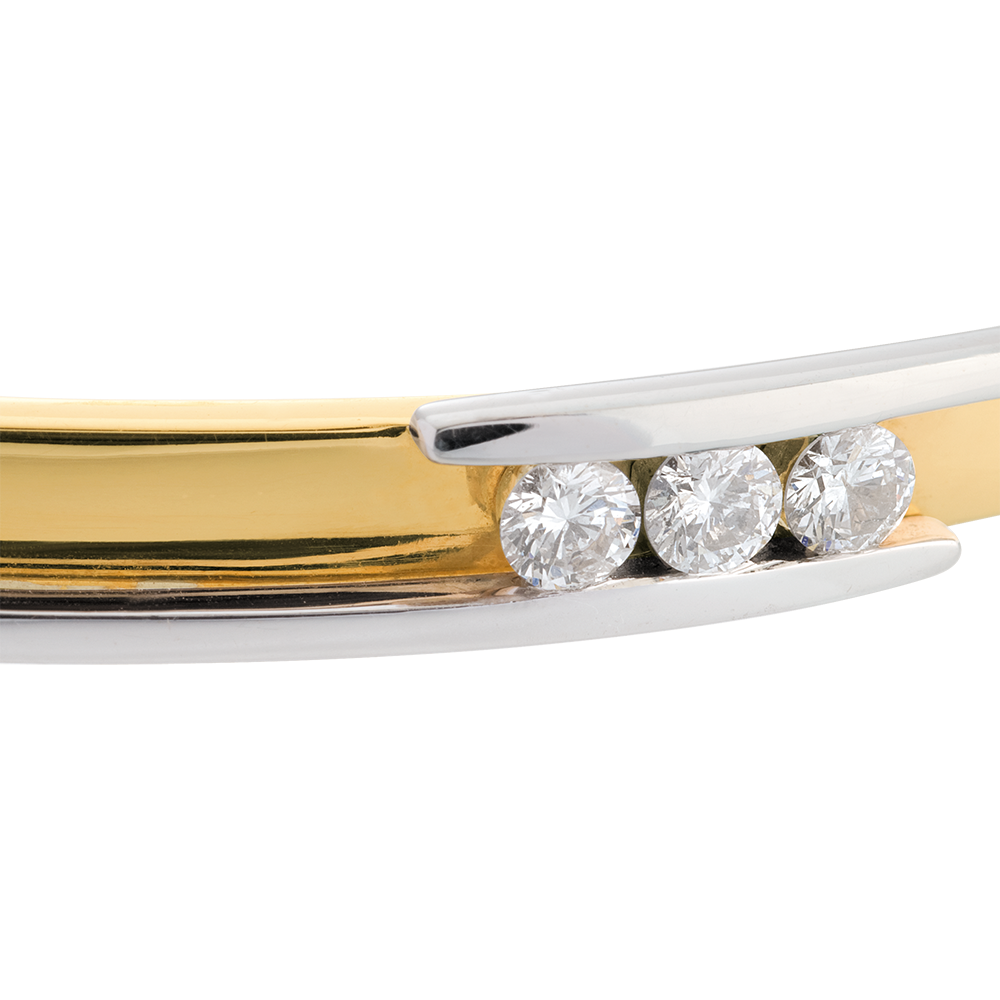 Bransoletka w kształcie koła w zestawieniu z siłą połączenia złota żółtego ze złotem białym, aby delikatnie podkreślić trzy diamenty.
