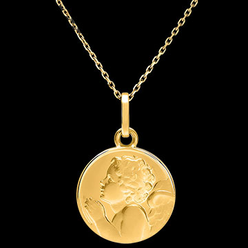 Przedstawiający anioła modlącego się, symbol czystości i ochrony, ten medalik ucieleśnia wiarę i spokój.